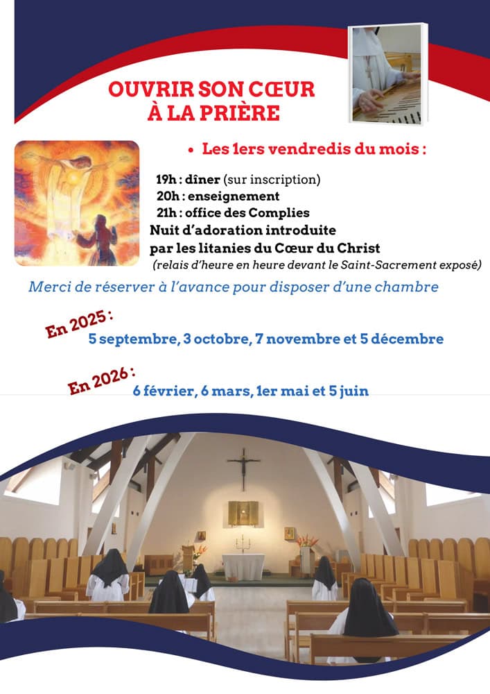 - Nuit d’adoration introduite par les litanies du Coeur du Christ (relais d’heure en heure devant le Saint-Sacrement exposé)
